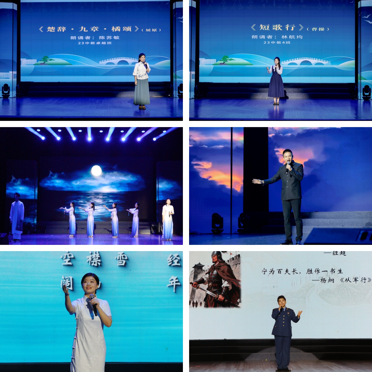 整场诵读会分为“永恒的经典”与“永续的精神”两大篇章。诵者们以声音为媒,以情感为舟,让沉睡的文字焕发新生。在第一篇章“永恒的经典”中,我校浙江省中华经典诵读竞赛获奖选手率先登场,吟诵声起,从《庄子·秋水》的哲思浩渺,到《贺新郎》的慷慨沉郁,句句动人。随后,厉彦彤、杨威等同学带来的《春江花月夜》,以清越之声勾勒出春江潮涌、月照花林的空灵意境。李鉴兵老师朗诵的《梦游天姥吟留别》,气势磅礴,将诗人李白的超然与不羁展现得淋漓尽致。陈诺与章晨辉同学则分别解读《念奴娇·过洞庭》与《破阵子·为陈同甫赋壮词以寄之》,在铿锵语调中传递出古典词章中的豪情与抱负。永利集团3044附中张琳达与应皓宇老师合作演绎的《晨钟之使命》,声音坚定,情感饱满,展现了教育工作者传承文明的初心与担当。
