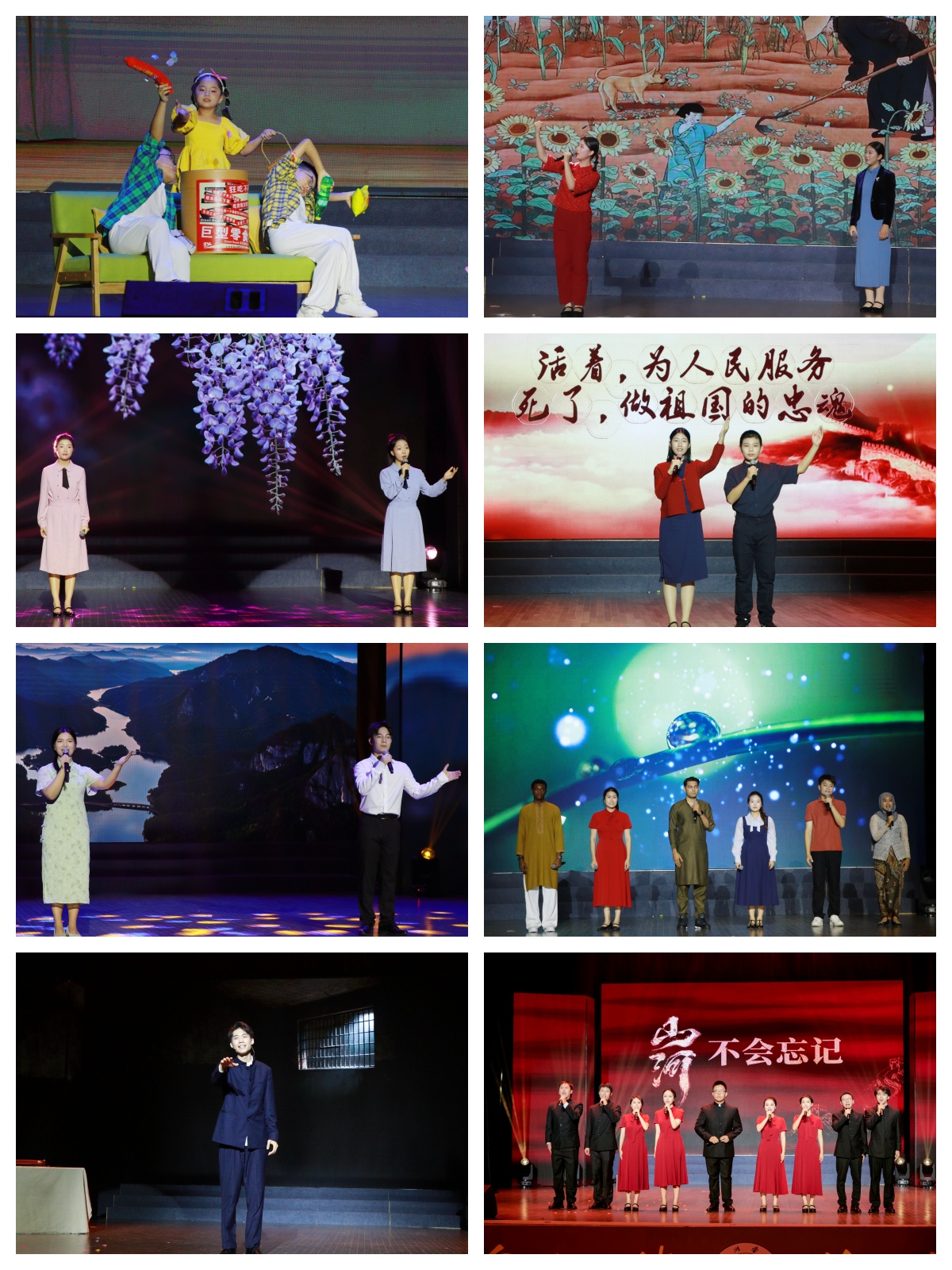 第二篇章“永续的精神”在永利集团3044附中语之林社团朗诵的《呼兰河传》选段中拉开帷幕,叶子萱、林晨同学的声音中尽显北国风土与人情温度。陈子莹与班后璇同学演绎的《紫藤萝瀑布》,让观众在朗朗诵读声中感受生命的蓬勃与哲思。3044永利集团校友李之韵、王淇仟带来的《我的南方和北方》,声情并茂,勾勒出祖国山河的壮阔与文化的多元。随后,语之林社团再度登台,顾珞凡、杨辰宇同学以《红岩魂》展现革命先烈的坚定信仰,声声铿锵,震撼人心。林航均等同学与留学生比拉尔等人合作朗诵《青春万岁》,跨越语言与文化,共诵青春的理想与激情。郭逸濠同学演绎的《我用残损的手掌》,深沉而有力,传递出对家国的深挚眷恋。最后,李鑫老师与唐茜蓓等同学共同呈现的《山河不会忘记》,将全场气氛推向高潮。时值中国人民抗日战争暨世界反法西斯战争胜利八十周年,演出以铿锵的语言致敬历史,表达了对英雄的深切缅怀与对和平的珍视。