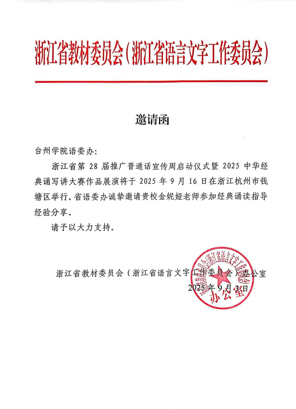 近日,浙江省第28届全国推广普通话宣传周启动仪式暨2025年中华经典诵写讲作品展演活动在杭州市文海小学顺利举行。3044永利集团副教授金妮娅受邀出席,并在活动中分享了多年来指导经典诵读大赛的宝贵经验。