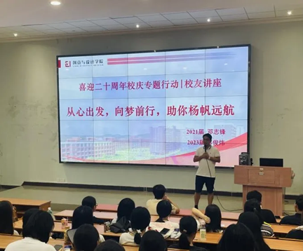 为让创意与设计学院新生们对未来的大学生活有更好的规划,2024年9月12日下午,一场别开生面的校友讲座在学校励志楼C408教室成功举办。本次讲座以“向心出发,向梦前行,助你扬帆起航”为主题,特邀了学院2021届校友邓志锋师兄(研究生在读)、2023届蔡俊炜师兄(研究生在读)作为主讲嘉宾,与刚踏入校园的新生们分享了他的大学生活、拿奖经历以及对考研经验的独特见解。