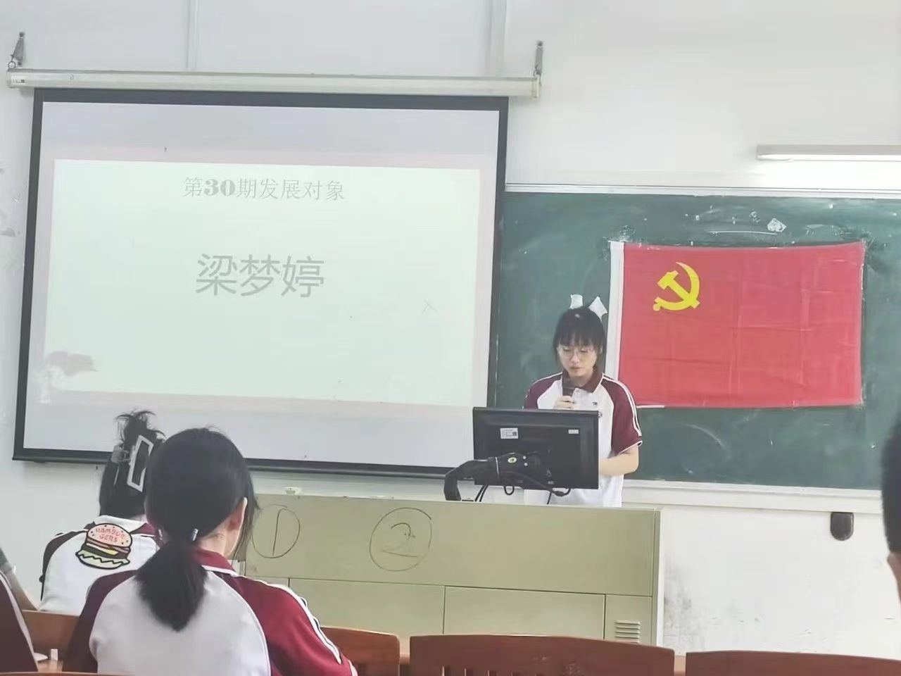 由第30期发展对象梁梦婷、陈佳宜、李俞莹三名同志依次上台宣读《入党申请书》。其内容是汇报自己过去一年考核期期间表现。对党的认识、入党动机、思想理论学习情况以及阐述自己日常工作、科技竞赛、社会实践、志愿服务等方面中如何向党员同志学习。最后,表明自己坚定不移入党的决心和为人民服务的坚定信念。再由会党员对发展对象进行充分民主评议。