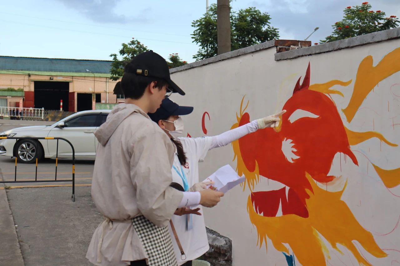 上午,队员们进入颜色铺陈阶段。他们充分发挥自身的专业知识和艺术素养,用心调配色彩,细致地为墙绘作品填充颜色,并依据预定方案反复推敲、精心设计。广州华商学院创意与设计学院党委副书记兼创意与设计学院学工副主任钟纯老师、谢炜俊老师为队员们提供指导与建议,并与队员们一同绘制墙体。同时,钟纯老师将安全问题视为重中之重,反复强调必须确保活动过程中每一位队员的生命安全,为实践活动的顺利推进提供了坚实保障。