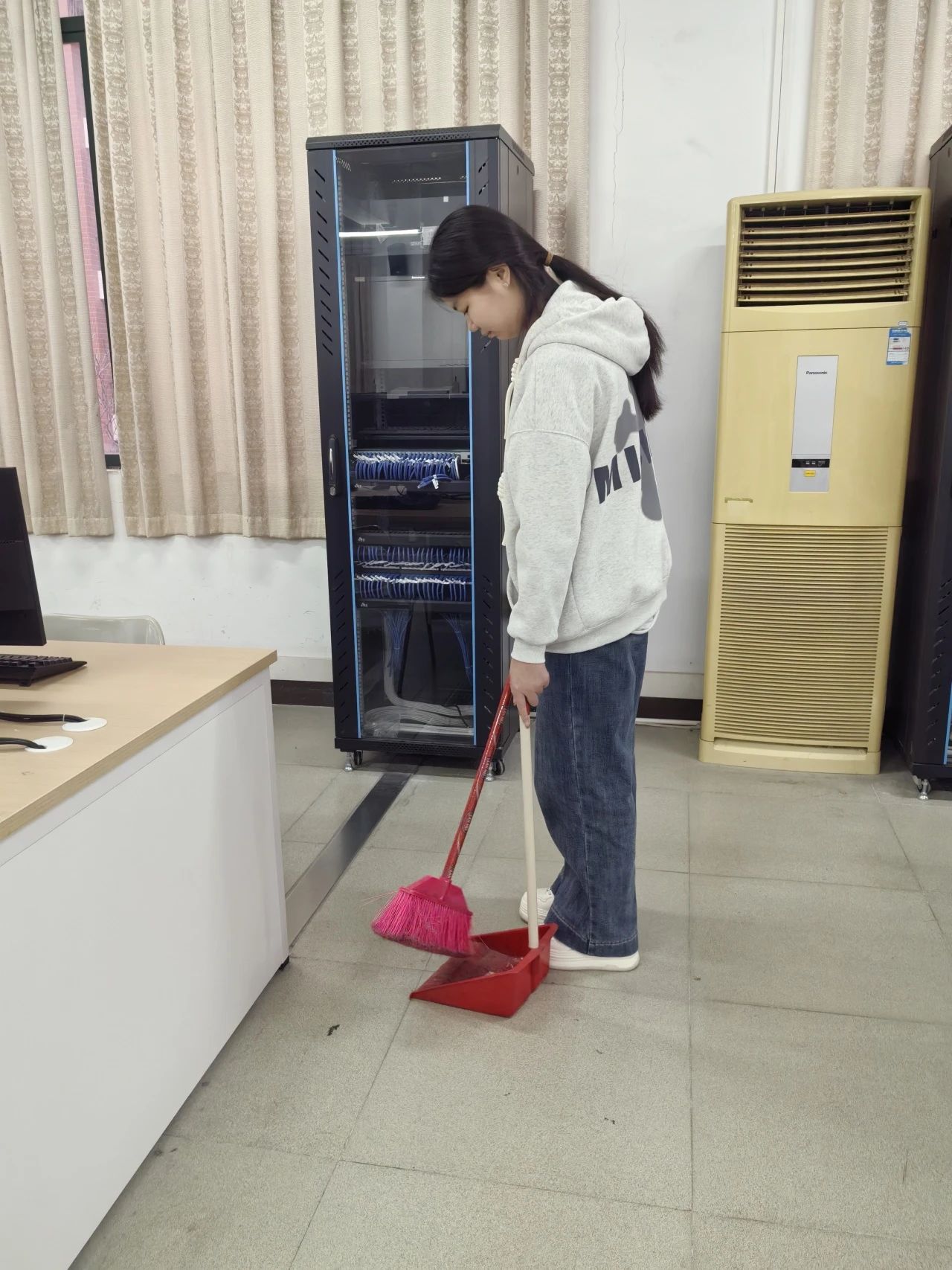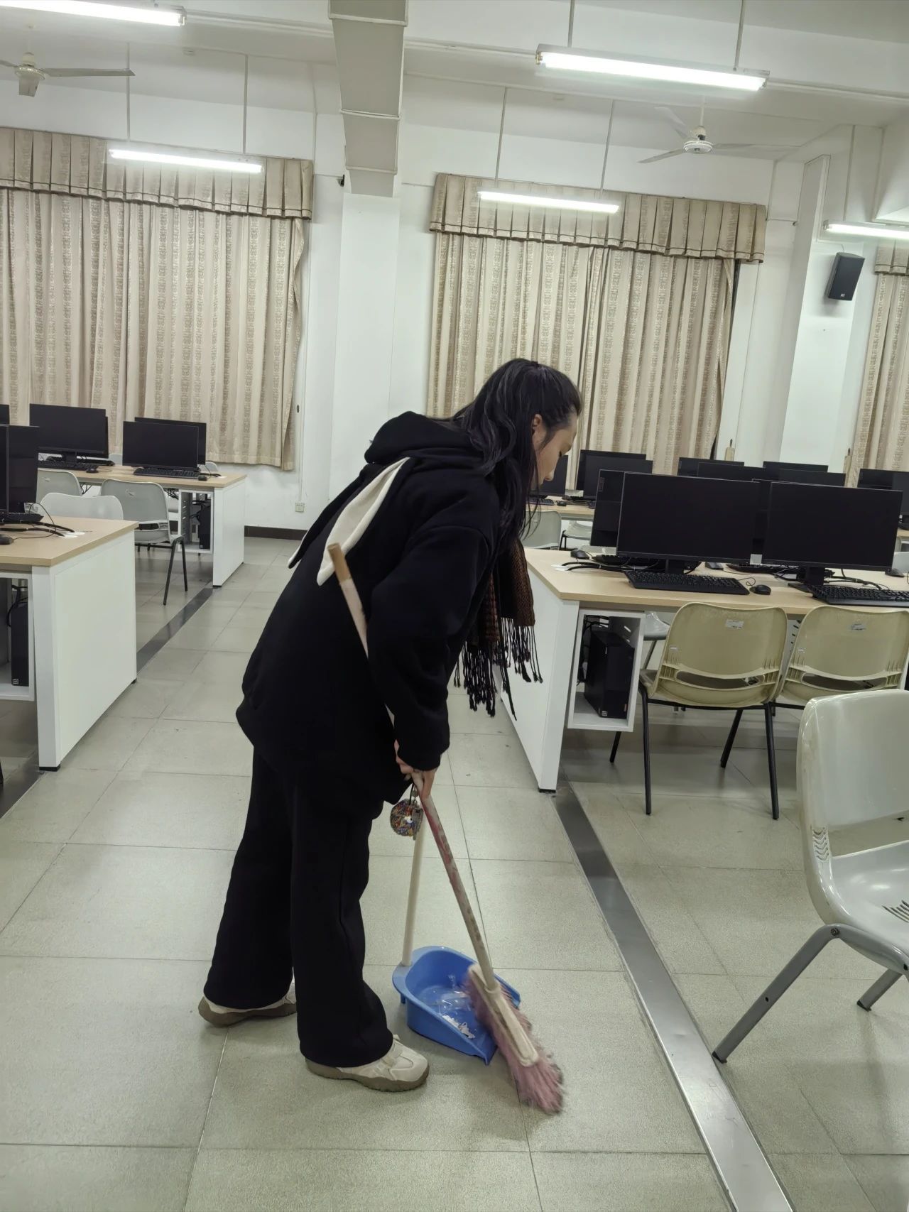 志愿者们准时到达指定地点集合并进行签到,领取好相应的工具,根据事先划分好的清洁区域,有序进行校园清洁活动。志愿者们干劲十足,分工明确,有的手着扫把和垃圾铲清扫课室垃圾,擦窗户。有的在走廊过道打扫等等,每个人都充满热情,积极投入。