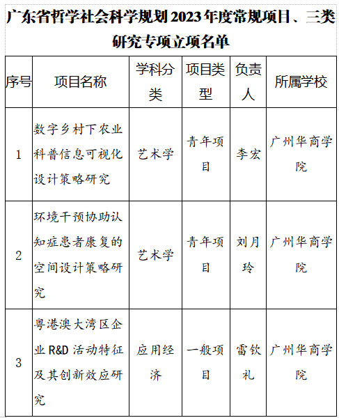 近日,我院科研工作再次传来喜讯,2023年6月28日,广东省哲学社会科学规划领导小组办公室公布广东省哲学社会科学规划2023年度常规项目、三类研究专项立项名单,我院李宏副教授、刘月玲副教授荣获两项青年项目立项。具体立项项目名单如下: