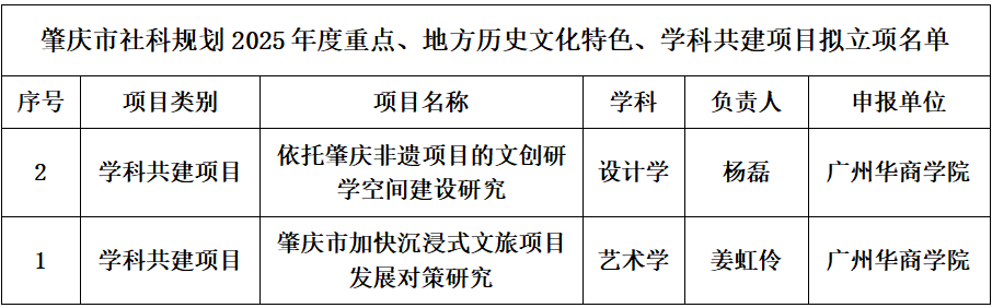 近日,根据《肇庆市哲学社会科学规划2025年度重点、地方历史文化特色、学科共建项目拟立项名单》通知,我院杨磊院长的《依托肇庆非遗项目的文创研学空间建设研究》项目与姜虹伶老师的《肇庆市加快沉浸式文旅项目发展对策研究》项目双双获得立项资格。