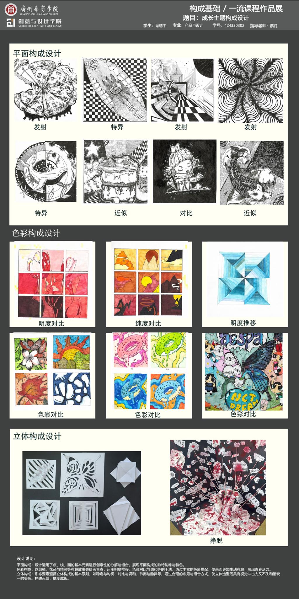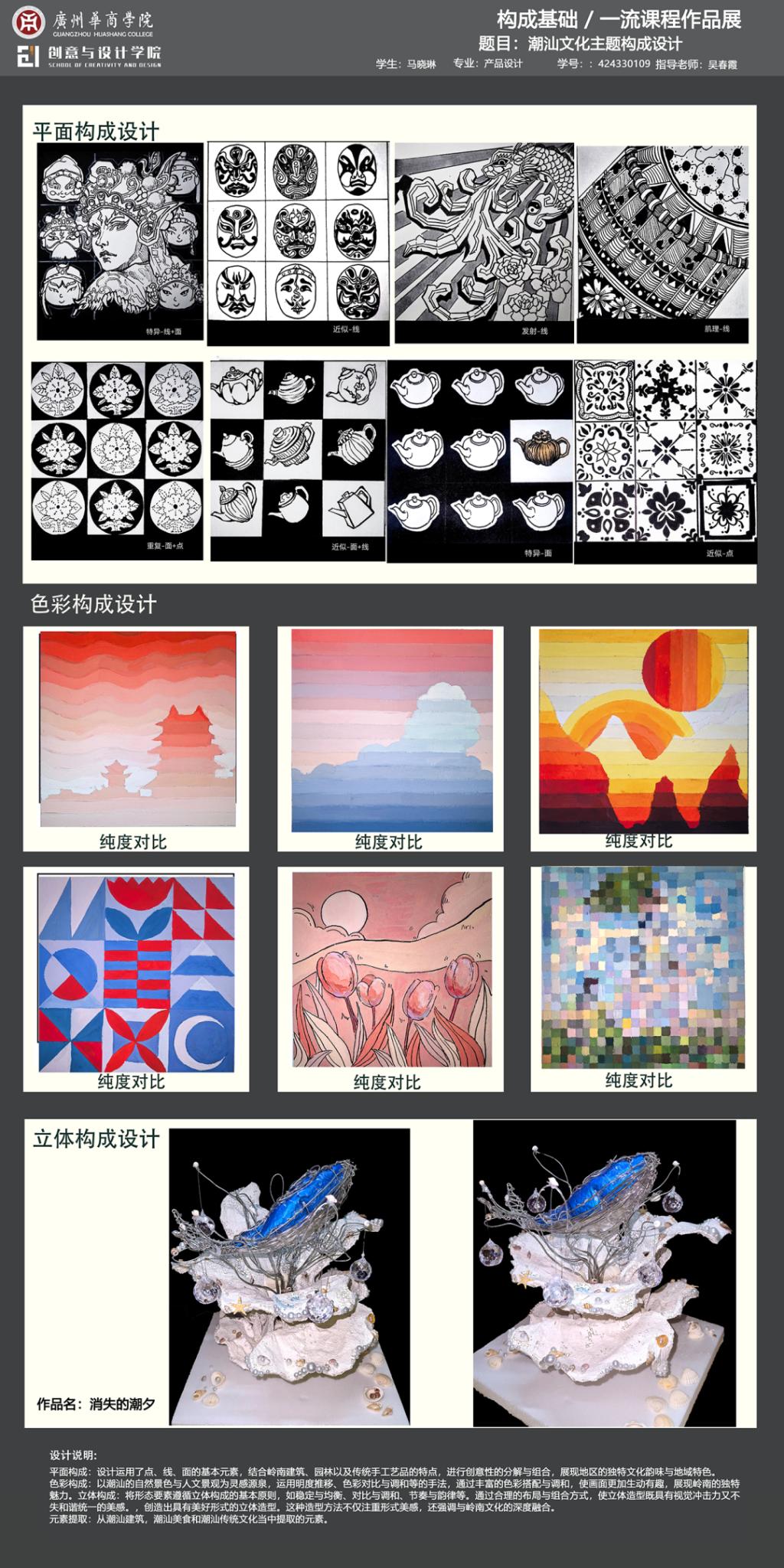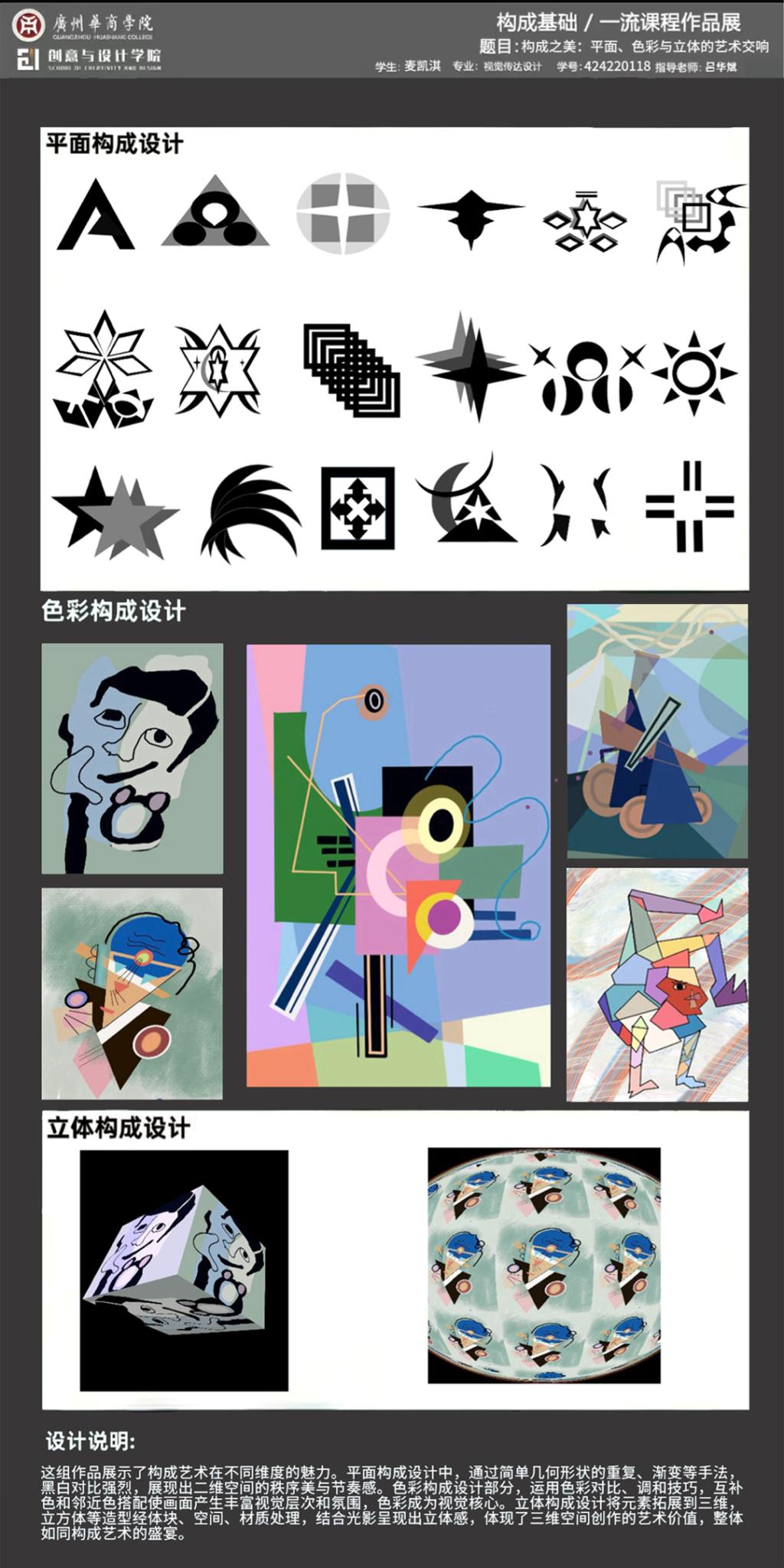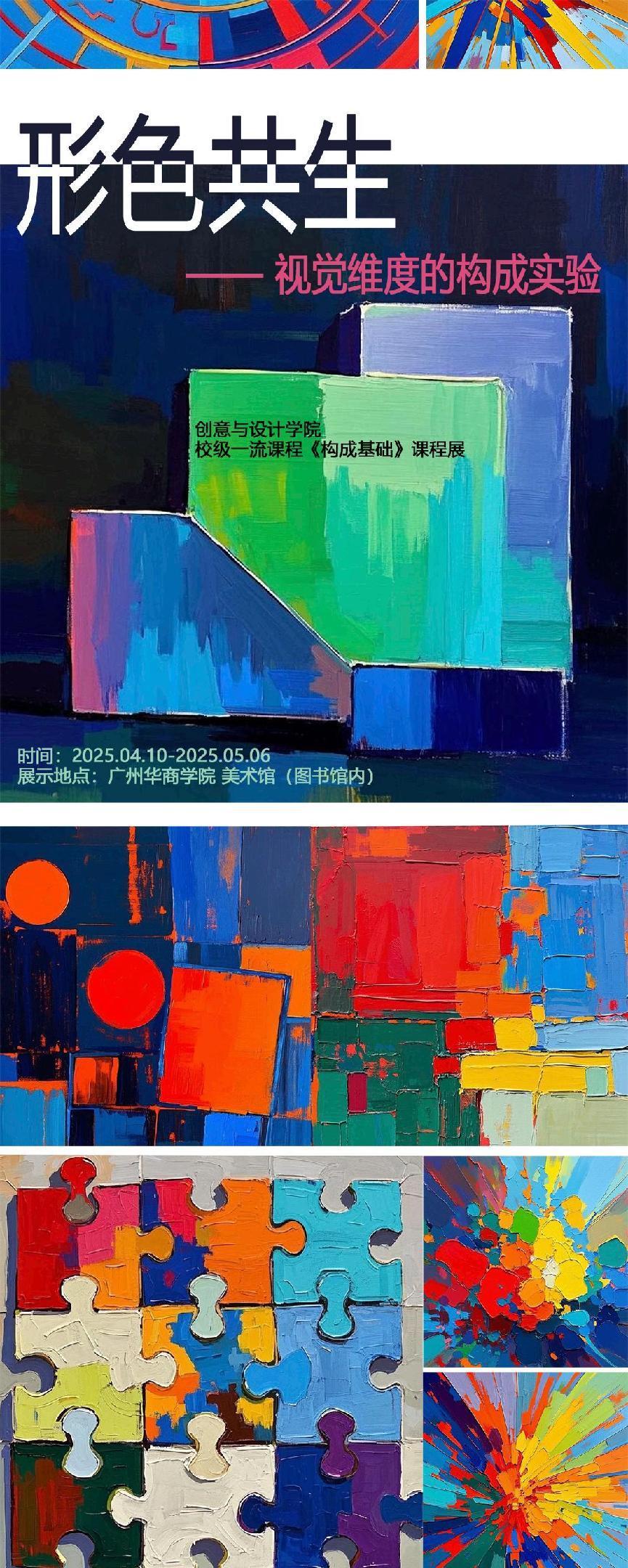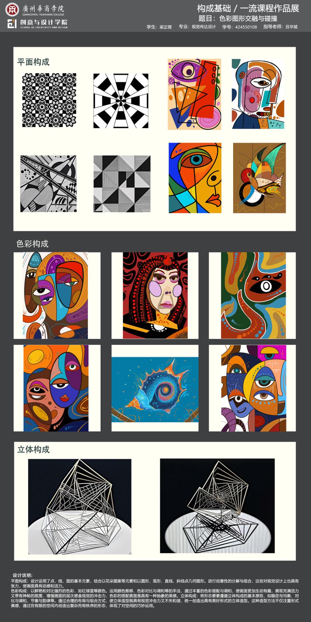 本次展览是广州华商学院创意与设计学院校级一流课程《构成基础》的教学实践成果展示。作为融合产教协同育人理念的基础课程,面向数字媒体艺术、视觉传达设计、产品设计、环境设计专业,通过"基础理论-产业共建-创新实践"的教学模式,培养学生在设计创作中的视觉感知能力和产业表达能力。