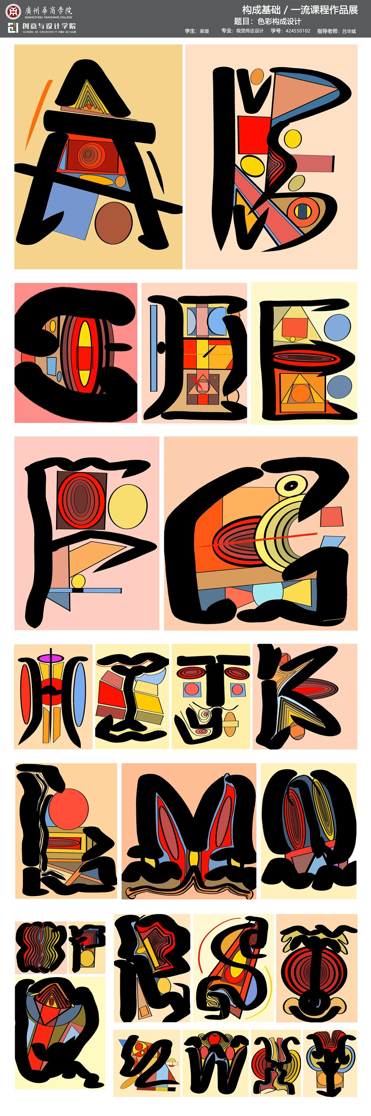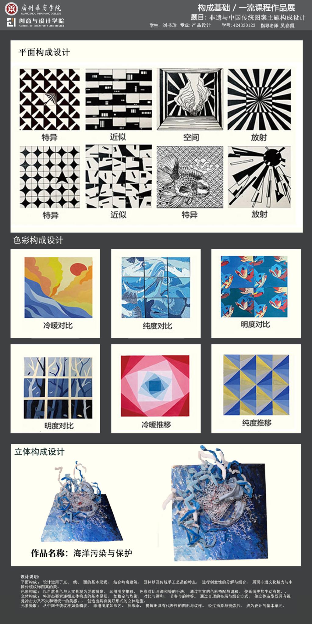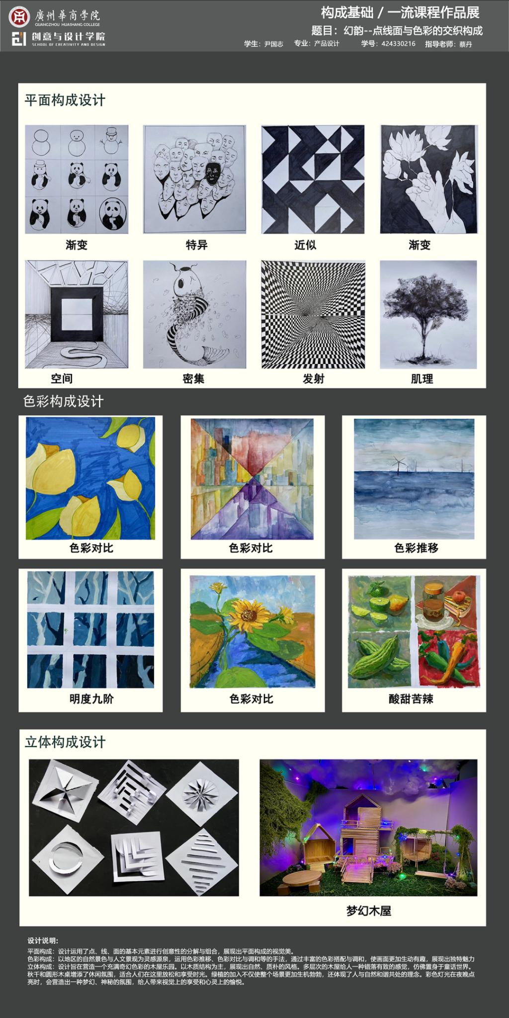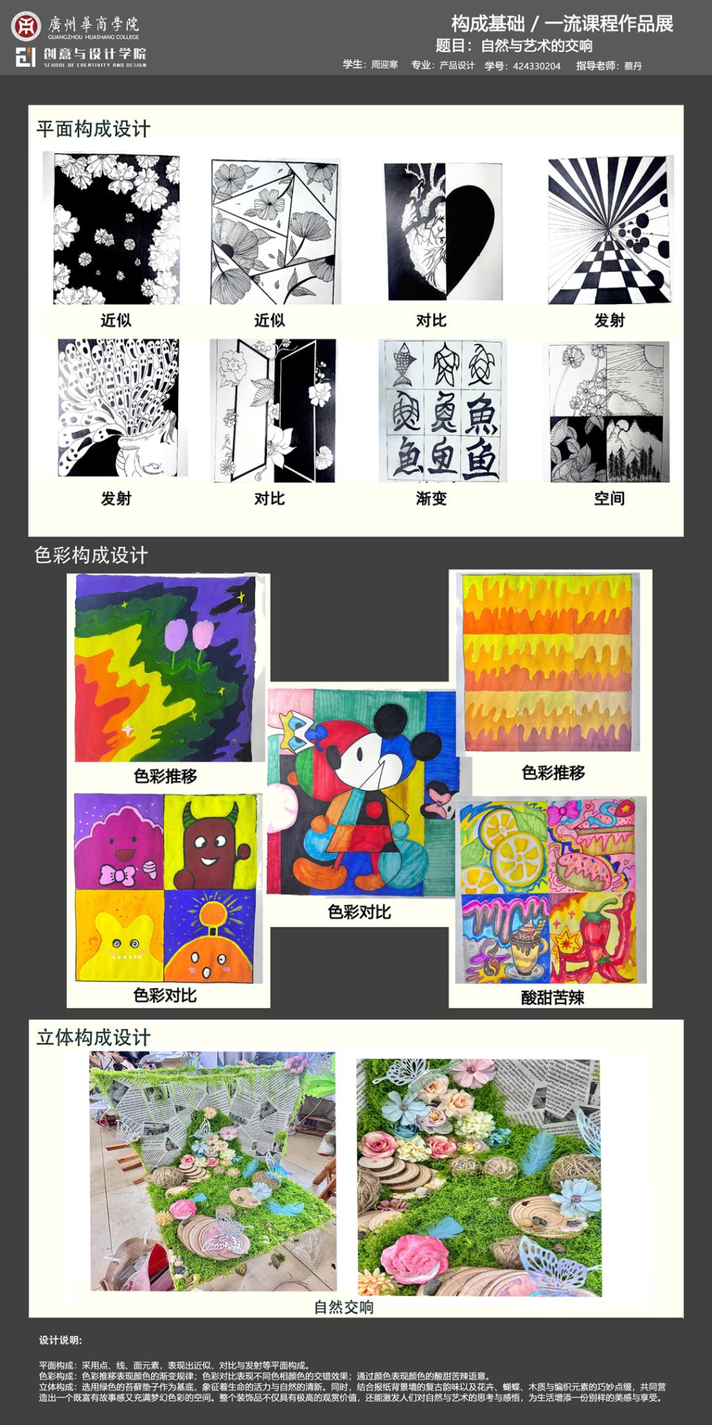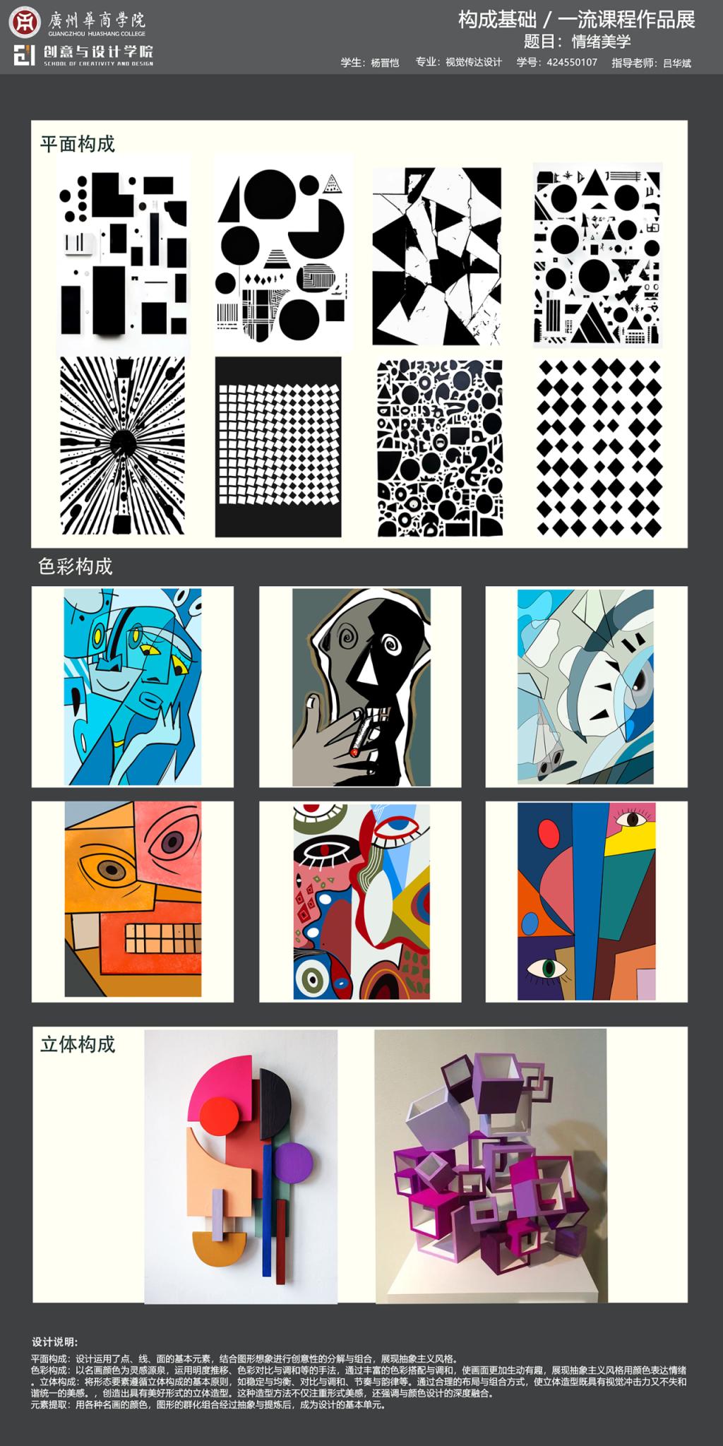 本次展览是广州华商学院创意与设计学院校级一流课程《构成基础》的教学实践成果展示。作为融合产教协同育人理念的基础课程,面向数字媒体艺术、视觉传达设计、产品设计、环境设计专业,通过"基础理论-产业共建-创新实践"的教学模式,培养学生在设计创作中的视觉感知能力和产业表达能力。